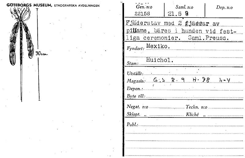 • S MUSEUM, ETNOGRAFISKA AVDELNINGEN Gen. mo 22158 Samt. n:o 21.5 Q Dep. n:o Fgderstav med 2' fjädtar av plliamel bäres i handen vid fest- liga Ceremonier. Saml.,PreusS. Fyndort: Mexiko. Huichol. Stam... Visa hela