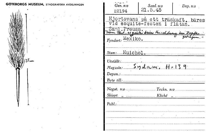 • - Gen. n:o 22194 iSam!. n:o 21. 5.45 Dep. n:o Hjortsvans på e tt träskaft , bäres vid. esquite-festen i flätan. Saml Preuss. "ku.. _ e4J Fyndort: Mexiko. Stam. Huichol. Utställt: Magasin: S' J_ Os... Visa hela