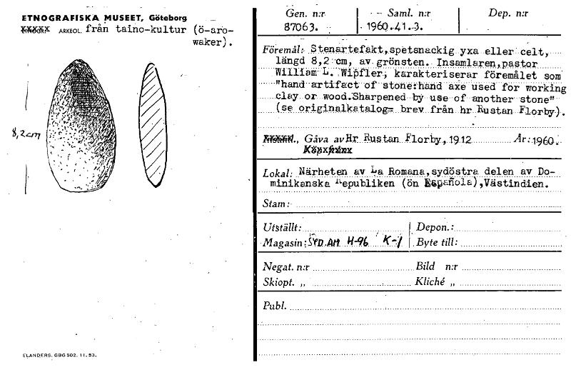 ETNOGRAFISKA !MUSEET, Göteborg . _ IP4,63V[ AWWL från taino-kultur (ö-aro- waker). g,24n-7 ELANDERS. 000 502. 11. 53. Gen. n:r 87063. I • -•• Samt. n:r - 1960.41.-3. Dep. n:r I . Föremål S tenartef åk...