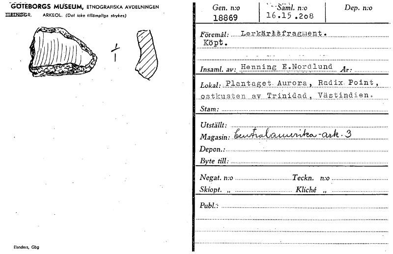 • -döTEBORGS MUSEUM, ETNOGRAFISKA AVDELNINGEN rarläratR. ARKEOL. (Del icke fillåmpliga sfrykes) Elanders, Gbg Gen. n:o 18869 —Saml. n:o 16.15 .208 Dep. mo Föremål: Ler är±åfragraent Köpt. _ Insaml. av:... Visa hela