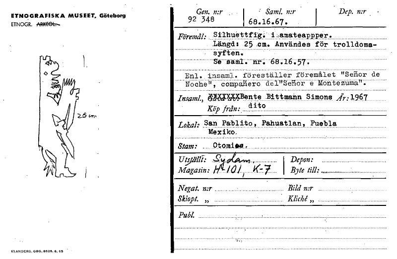 ETNOGRAFISKA MUSEET, Göteborg ETNOGR. Gen. n:r 92 348 S'aml. n:r 68.16.67. Dep. n:r • Föremål: Silhuettfig. i ..amateappper. Längd: 25 cm. Användes för trolldoms- syften. Se saml. nr. 68.16.57. Enl.. insaml. föreställer föremålet "SeRor de Noche", compafiero delnSerior e Montezuma". Insaml., MOSUBente Bi ttmann Simons jr:1967 Köp från: dito. Lokal: San Pablito Pahuatlan, Puebla Mexiko. Stam: Ot0n11-041 • Depon: Magasin: HIL Id ) K-7 i Byte till: Negat. n:r Bild n:r Skiopt. „ • Kliché,, Publ. ELANDERS. G8G. 8626. 6. 65 [ocr]Stäng