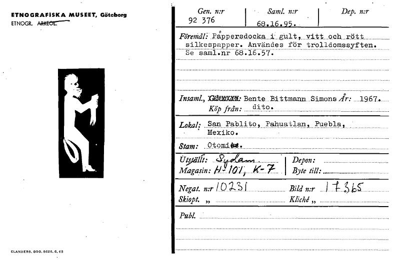 ETNOGRAFISKA MUSEET, Göteborg ETNOGR. ARt(fOrr- Gen. MT 92 376 Sand. n:r I Dep. n:r 68.16.95. P4Persdocka i, gUlt, vitt och rött silkespapper. Användes för trolldomssyften. Se saml.nr 68.16.57. Insam1„20~: Bente....Bittmann...Simons År: ....19.67.. Köp från: dito, Lokal: San Pablito, Pahuatlan, Puebla, ° Mexiko. Stam: Otomilui. Depon: Magasin: /0/ K 7 Byte till: Negat. n:r 1093 f Bild n:r 1 Skiopt. „ Kliché,, Publ. L N D ERS .GE3G.13626. R. 65 [ocr]