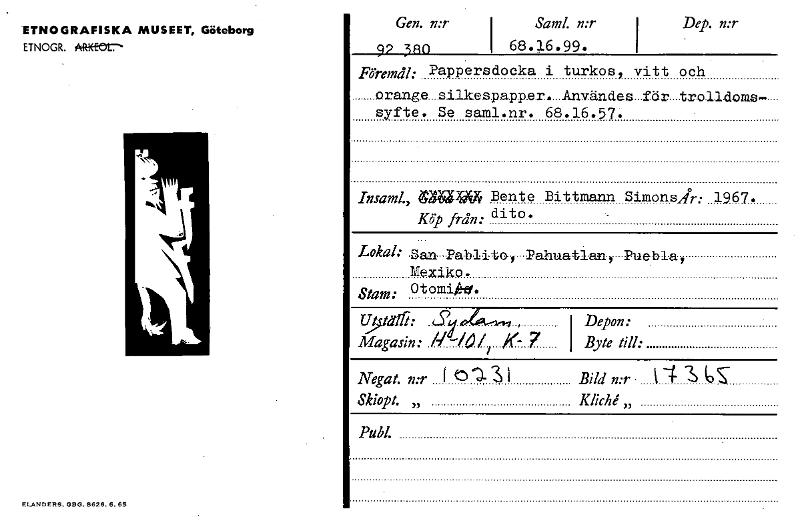 ETNOGRAFISKA MUSEET, Göteborg ETNOGR. ~Or" Gen. MT I Sand. MT Dep. MT 92 3A0 I 68.16.99. I Fören/åh Pappersdocka i turkos, vitt och orange silkespapper..Användes .ftir trolldome- syfte. Se saml.nr. 68.16.57. huald, WiWAX Bente Bittmann Simonajr: 1967. Köp från: dito. Lokal: San Fablito, Pahuatlan, Puebla, Mexiko. stivw: Otomik«. 9mi17: (-5 Depon: Magasin: I / K- 7 I Byte till: Aregat. n:r g 0.1Si Bild n:r Skiopt. „ Kliché,, Pub!. ELANDERS. GDG. 9626.6.65 [ocr]