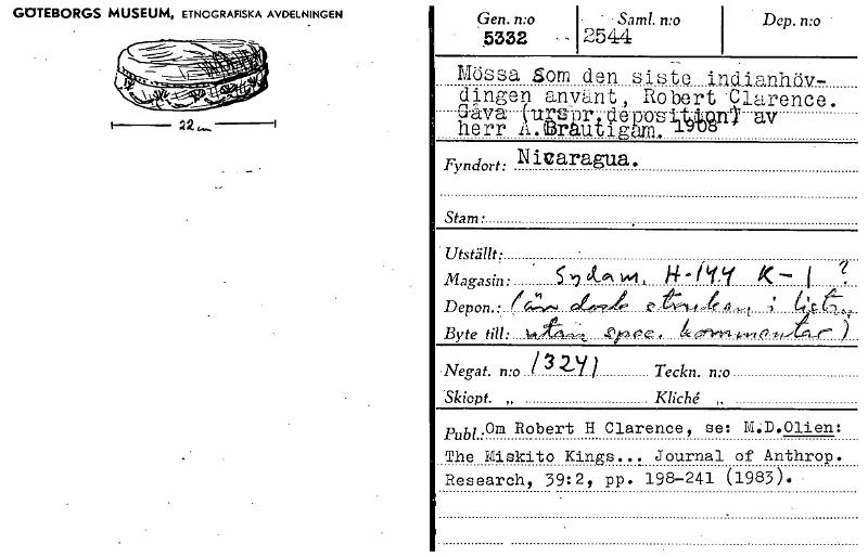 GOTEBORGS MUSEUM, ETNOGRAFISKA AVDELNINGEN Gen. n:o ' • 5332 — ' - Samt. n:o 2544i Dep. n:o - Mössa Som den siste indlanhöv- dingen använt, Robert Clarence. . Gåva (urem-depus ApT-av ' herr A.Eir utigam. Fyndort: Nicaragua. Stam • Utställt : • Magasin • ' 5 1.2 J." imi 1 H-P-ty k- 1 2 Depon.:.(-; Byte till:. • Negat. n:o / 3241 Teckn. n:o 'Skiopt. „ Kliché „ pubLOm Robert H Clarence, se: The Miskito Kings... Journal Research, 39:2, pp. 198-241 M.D.Olien: of Anthrop. (1983). • [ocr]Stäng