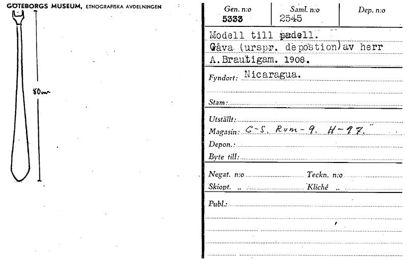 • GOTEBORGS MUSEUM,. ETNOGRAFISKA AVDELNINGEN Gen. n:o i Samt. n:o 5333 I 2545 Dep. n:o Modell till tadell. Gåva .(ursp-r. depdstion)av herr A.Brautigam. 1908, Fyndort Nicaragua. Stam • Utställt. Magasi... Visa hela