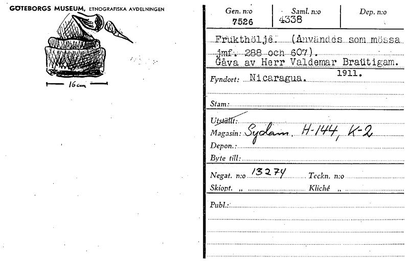 GOTEBORGS MUSEUM, ETNOGRAFISKA AVDELNINGEN Dep. n:o Fttik.thäljä. 607 ) . Gåva av Herr Valdemar Bratitigam. 1911. Stam • Utrn Magasin: _ (7,,~4n , A4 44 , / Depon.: Byte till: Negat. n:o /3 2. 7,Y Teckn. n:o Skiopt. „ Kliché Publ • Gen. mo 7526 • Saml. n:o 4338 Fyndort: Nicaragua. [ocr]