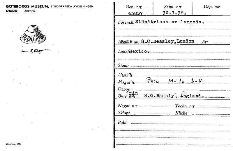 GOTEBORGS MUSEUM, ETNOGRAFISKA AVDELNINGEN MIM». ARKEOL. Gen. n:r 45837 Saml. n:r 30•7.38• Dep. n:r e, Föremg:Sländtrizz a av lerg.odz Ii1377t0 av: E.,•.C.,.Be.E.48]..eY.,IrOndOn Ar: LokalMexic.o • S...