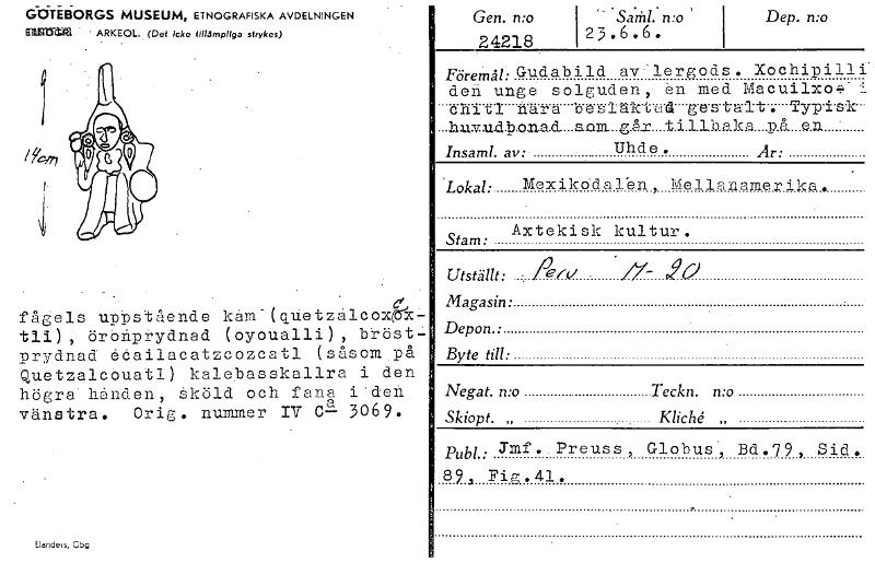 GtifiliORGS MUSEUM, ETNOGRAFISKA AVDELNINGEN Eaänn.fil ARKEOL. (Det icke tillömpliga strykes) \ti fågels Uptstående kamIqUetzalcoxgX.'- tli), örbhprydnad (OyOUalli), bröst prydnad edailacatzcozcatl (såsom.på QuetzalcOuatl) kalebasskallra i den högra' handen, Sköld och fana i'den vänstra. Orig. nummer IV C-9- 3069. Elareels,Gbg Gen. wo 24218 - 'Saka.' wo ' 23. 6 . 6 . Lkp. wo Förein åL. Gudabild av:lergods. Xochipilli deh unge solguden, ån med Macuilxof.- chlt1 nara oesläkId& ge'stalt. Typd-s-k ..1111:vuld.D.onad_som_gAx_til1haks PÅ .e.n ' hmaml. aw:' • Uhde. Är: loka/: Mexikddalbn, Melln,-merike. Axtekisk kultur. Stam: • Utstänt: - .79e(V • ./7- Yo Magasin: Depon.• Byk till: Negat. n:o Teckn. nu) Skiopt. „ KlicU „ pun: Jraf . . Preuss , Globus', Bd .79 , S id . 89 , Fig .41. - [ocr]