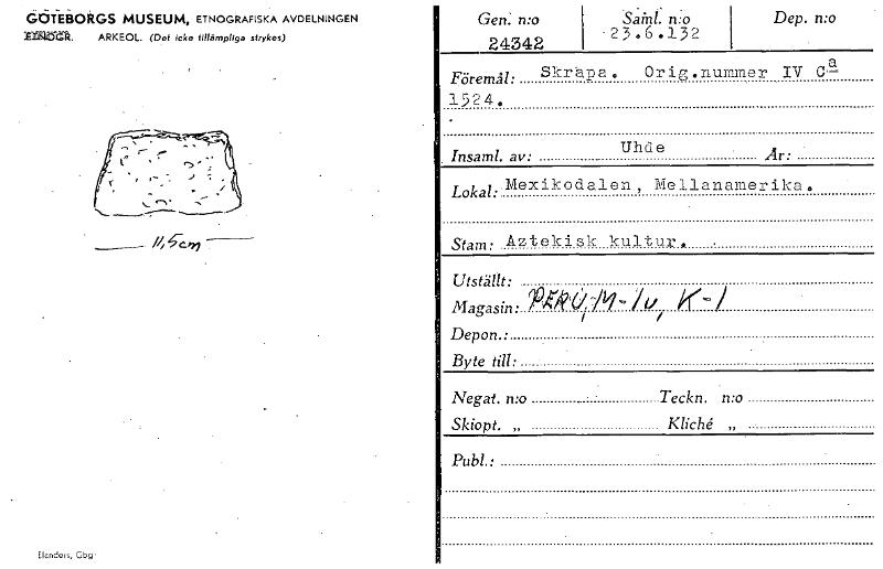 • G-KSTEBORGS MUSEUM, ETNOGRAFISKA AVDELNINGEN lägda. ARKEOL. (Det icke tillämpliga strykes) 4-c.>7 Eknders, Gbg • Gen: n:o 24342 Sainl. wo 1 • 2 3 0 6 .1.32 Dep. n:o Föremål:SkraDa . Or lp; .nummer IV... Visa hela