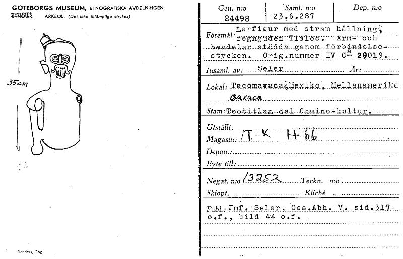 GOTEBORGS MUSEUM, ETNOGRAFISKA AVDELNINGEN klingifgrå. ARKEOL. (Det icke tillämpliga strykes) r-> Elandels, Gbg Gen. n:o 24498 • Saml. n:o 23.6.28'7 Dep. n:o Lerfigur med stram hållning:, Föremål:reg....