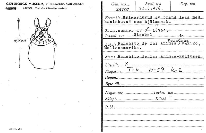 GOTEBORGS MUSEUM, ETNOGRAFISKA AVDELNINGEN fetiggy?. • ARKEOL. (Det iCke tillämpliga strykas) Elanders, Gbg Gen. n:o .._ 24707 Säml. nio 2 3 . 6 . 4 96 . Dep. . n:o Förem,i/:...Erigarhuvwl...av ................................. kaninhuvud som hjälmmask. --0-r-i-g,numn.ier IV CS- 16754, • Insaml. av: Strebel Är: VeraQrAz . Lokal: Ranchito de las Animasdmexiko, Mellanamerika. Stam: .Ranclit.o....d.e....las...An.i.m.as.,kulturen Utställt: X Magasin: 7-- lc, . H52 k- 2- Dep o n . • , Byte till: Negat. n:o Teckn. n:o Skiopt. „ Kliché „ Publ.. [ocr]