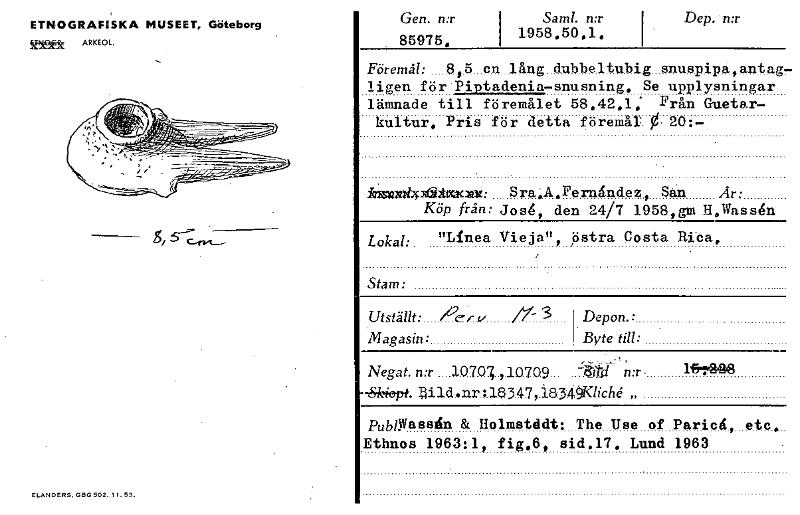 • ETNOGRAFISKA MUSEET, Göteborg Sffitit ARKEOL 5 I r ELANDERS, DAG 502. 11.53. Gen. n:r 85975, Sam!. n:r i 1958,50,1• i . Dep. n:r Föremål: 845 en lång dubbeltubig ligen för Piptadenia—snusning„ snus... Visa hela
