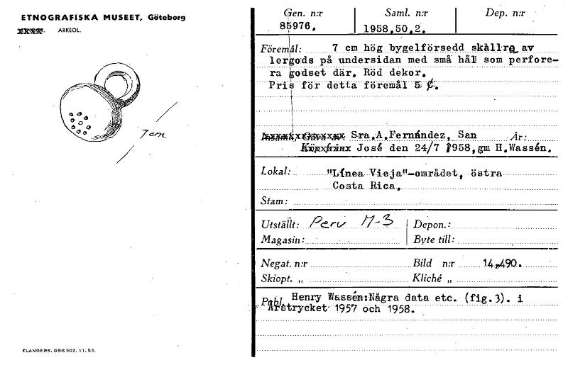 ETNOGRAFISKA MUSEET, Göteborg =XI ARKEOL. Gen. n:r 85976, Sam!. n:r 1958.50,2. Dep. 'n:r Förenål: 7 cm hög bygelförsedd skällra, av lergods på undersidan med små håll som perfore- ra g' o:dset där. Röd dekor. Priå för detta foremål 5-0,„ /431A14190~xybik SraiA,Ferniindez, San • ESOcc,b2rxx José den 24/7 1958,gm H,Wass6n, "Linea Viejan—området, östra Costa filca. Stam: Lokal: Utstäfit: /9CrG/ /74> Magasin: • Depon.: Byte till: Negat. n:r Bild n:r 14,,490.. Skiopt. „ Kliché „ p.41 Henry Wassen:Några data etc. (fig.3). i ItYsåtrycket- 1957 och 1958. ELANDERS. GBG 502. I 1.53. [ocr]