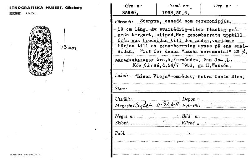 ETNOGRAFISKA MUSEET, Göteborg DMVGX* ARKEOL. ELANDEIRS. GBG 502. 11.53. •Gen. n:r 85980. Sam!. n:r , i 1958.50.6, i Dep. n:r • Föremål: Stenyxa, ansedd som ceremonipjäsl 13 .cm-läng. Av:•svartådrig-eller -fläckig. gr&- grön .b.ergart„...slipad.11ar..genomborrats...uppti.11 från ena bredsidan till den andra,varjämte början till en genomborrning synes iså ena smal. sidan, Pris för denna "hacha ceremonial" 25 0 mgämpapranegc Sra „A ,Feniåndez , San J 0- Ar : Köp från:s6,d4,24/7 ^958, gm 11,Wass6n, Lokal: ... A!Linea-Vieja!!-onirådet , östra-Costa-Rica,- . . Stam : Utställt: , Magasin :,',.S i // 9h 4. - - 0 Depon.: Byte till: Negat. n:r • Bild n:r , Skiopt. „ Kliché „ ' Pub!. . • _ / 37 [ocr]