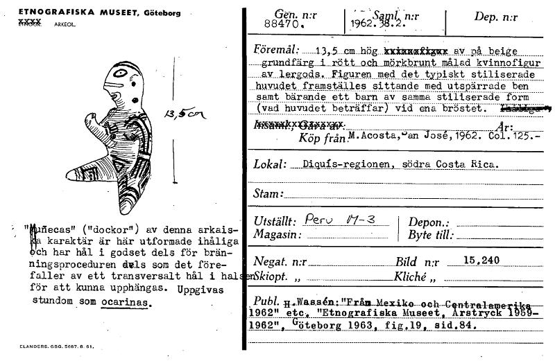 ETNOGRAFISKA MUSEET, Göteborg • Mela ARKEOL. Gint n:r 88470. i ' - 1962'Saud n:r .38.2. i Dep. n:r Föremål: 1J,5_em grundfärg_l_rött av lergods. Figuren huvudet framställes samt bärande ett (vad huvudet beträffar) ~4/62~4W: . K.513frånpl.Acosta, och mörkbrunt hög kitoolm zaocr av på beige målad kvinnofigur med sittande barn av vid det typiskt med an jåse,1962. samma stiliserade ena bröstet. stiliserade utspärrade ben form Paiiiiicam Är: Co1.125.- Lokal: Diquis-regionen, södra Costa Rica. Stam: Utställt: Per k} 6'l-3 Magasin: Dep on.: Byte.. till: Negat. n:r_ .mSkiopt. „ _ Bild n:r Kliché,, 15.240 1962" etc-. "Etnografiska 496211, Göteborg Pub!. _R-Was_akrulTråna__Mexilio----ach---C- Museet, 1963, fig.19, sid.84. ntralftwertk4 Irst17ck 1U59 - flecas" ("dockor") av denna arkais- karaktär är här utformade ihåliga ch har hål i godset dels för brän- ningsproceduren dyns som det före- faller av ett transversalt hål i hal för att kunna upphängas. Uppgivas stundom som ocarinas. ELANDERS. GBG. 5687. 8. 61. [ocr]