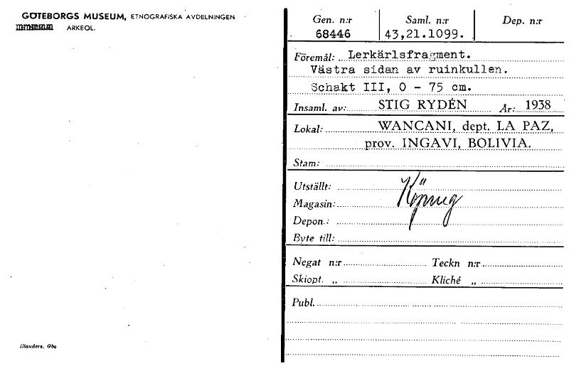 GOTEBORGS MUSEUM, ETNOGRAFISKA AVDELNINGEN Mal ARKEOL. Gen. n:r 1 Saml. n:r Dep. n:r 68446 43,21.1099. . Föremål: Lerkärlsfragment. aanders, GIN Västra sidan av ruinkullen. 3chakt III, 0 — 75 cm. Insaml. av • STIG RYDÉN Ar: 1938 Lokal: WANCANI, dept. LA PAZ, prov. INGAVI, BOLIVIA. Stam: Utställt: Magasin: Depon.: Byte till: Negat n:r Teckn n:r. Skiopt. „ Kliché „ Pub!. [ocr]