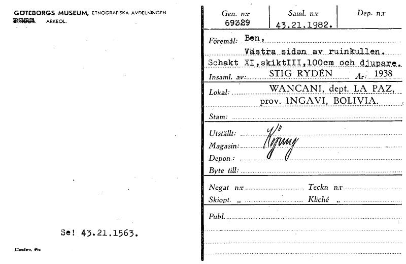GOTEBORGS MUSEUM, ETNOGRAFISKA AVDELNINGEN ARKEOL. Gen. n:r 69329 Sam!. n:r 43.21.1982. Dep. n:r Se! 43.21.1563. Föremål: Ben, Västra sidan av ruinkullen. Schakt XI,skiktIII,100cm och djupare. av STIG. RYD Är: 1938 • Lokal: WANCANI, dept. LA PAZ, prov. INGAVI, BOLIVIA. Stam: Utställt: Magasin: Depon.: Byte till: Ålegat n:r Teckn n:r Skiopt. „ Kliché „ Pub!.. INanders, [ocr]