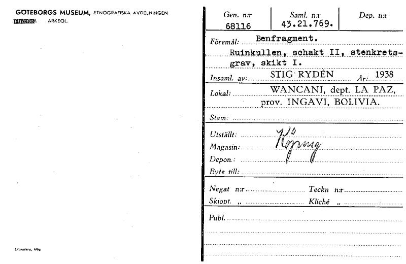 GOTEBORGS MUSEUM, ETNOGRAFISKA AVDELNINGEN 017114139R. ARKEOL. Gen. n:r Sam!. n:r Dep. n:r 68116 43.21.769. 1 Föremål: Benfragment. Ruinkullen, schakt II, stenkrets- grav , skikt I. STIG RY • 1D2N Insaml. av Är: 1938 Uanders,04 Lokal: Stam: WANCANI, dept. LA PAZ, prov. INGAVI, BOLIVIA. Utställt: d/b Magasin: U29/ 44. Depon.: , Byte till: Negat n:r Teckn n:r Skiopt. „ Kliché „ Pub!. [ocr]