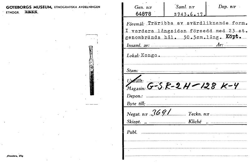 • GOTEBORGS- MUSEUM, ETNOGRAFISKA AVDELNINGEN ETNOGR. XNafa.. Gen. n:r 64878 'Sam!. n:r å 943.6.17. Dep. n:r Föremål: Träribba av svärdliknande_foxm. I vardera_lAngsidan_flir.s.add_med_23-st, .genmbrä... Visa hela