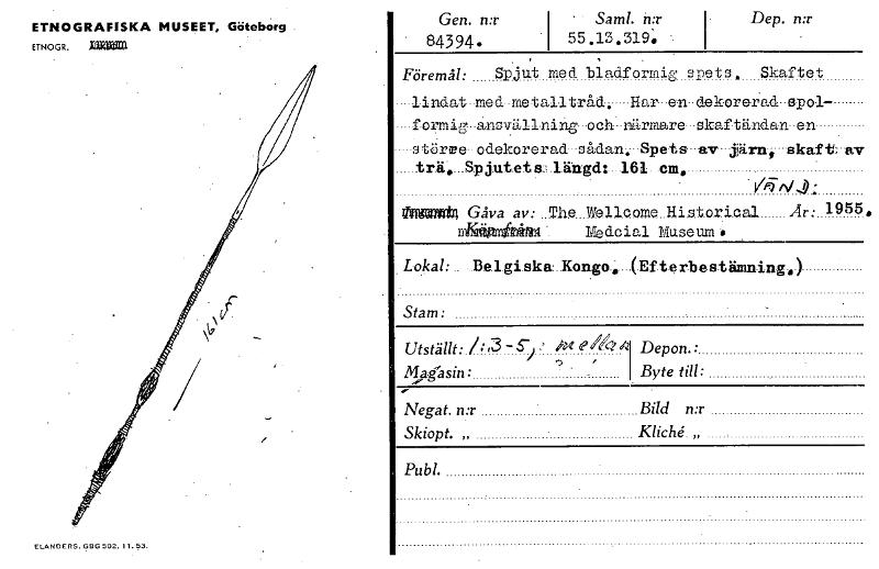 ETNOGRAFISKA MUSEET, Göteborg ETNOGR. Uff= ELANDERS. 900 502. 11. 53. Gen. n:r ' • Sam!. n:r - 84394. -1 55.13.319. -- • Dep. n:r i , Föremål: Spjut med bladformig spets,, Skaftet ---- lindat-med-met...