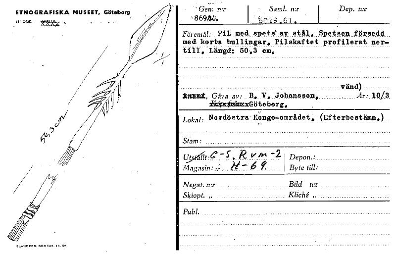 Dep. n:r . - • Gen: 'n:r 8 6944„ I• Sam!. n:r i %C:Y:9 .61. Depon.: Byte till: Bild n:r Kliché „ t}5«ts1it:e7S. k fr 4n —2 magasin:J , W. Negat. n:r Skiopt. „ ETNOGRAFISKA MUSEET, Göteborg ETNOGR. ffitSe ELANDERS, GAS 502. ¶1.53. Föremål: Pill med spets' av stål, Spetsen försedd med korta hullingar, Pilskaftet profilerat ner- till, Längd: 50.3 cm, vänd) kiant, Gåva av: B, V. Johansson* Ar : 10/3 iäämixiauxGöteborg„ Lokal: Nordöstra Kongo—området, (Efterbestämn„) Stam: Pub!. [ocr]