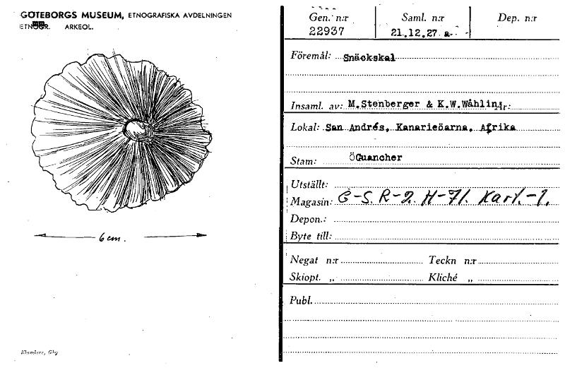 • GOTEBORGS MUSEUM, ETNOGRAFISKA AVDELNINGEN JE T". ARKEOL. 6e44/. Gen.- n:r . 22937 Sam!. tur ' 21..12.27. 9,7 - Dep. n:r Föremål: —STA-ok-skal Insaml. av: M.Stehberger 8,6 K.W.WåhlinÅr: Lokal: .San...AndreLs.,...Kanarieiiarna,. A;rikat Stam: ÖGtut.ncher i r Utställt: ;Magasin: —.5.: R4. Depon.: Byte till: nit i ' Negat n:r Teckn n:r Skiopt. „- Kliché „ PubL [ocr]