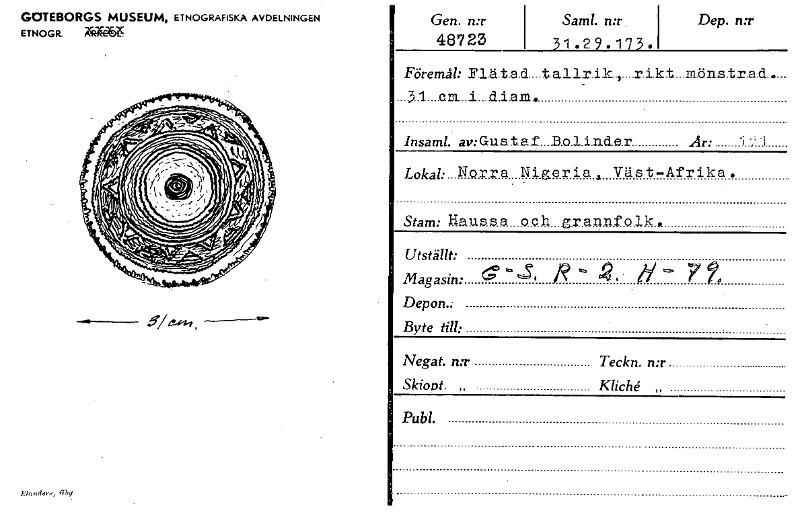 • GOTEBORGS MUSEUM, ETNOGRAFISKA AVDELNINGEN ETNOGR. ZRWETEZ 5/4441, E/andar, 6'19 Gen. n:r 48723 Samt. n:r i 3 1 . 2 9 . 1 7 3 . Dep. n:r Föremål: 3.1.ä.ta.d t all.r.i.k.,....r.i.kt...m.ön..str.a.d...... Visa hela
