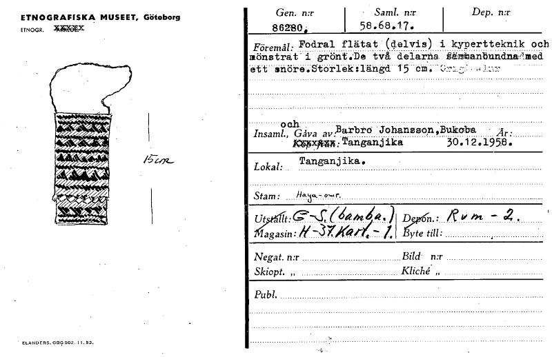 ETNOGRAFISKA MUSEET, Göteborg ETNOGR. 2RWPC Gem nx I Sam!. n:r 86280, i 58.68.17. Dep. n:r Föremål: Fodral flätat .(delvis) 1 kypertteknik och utön.strat- i grönt-.De två delarna. tärsitanbundnamed ett anöre.Storlek:längd 15 cm.. oh sson,Bilkaba År: Insaml.,c Gåva av:Barbr° Johan Kg9sx,rägl:Tanganjika 30.12.1958. Stam: Up#Kt:Crt (4»i_j14 Magasin: --37)(arr, - Lokal: Tanganjika. /6-20z- De on.:ft.L'Pfrt yte till: Negat. n:r Bild- n:r Skiopt. „ Kliché,, Pub!. • ELANDERS. GBG 502. 11. 53. [ocr]