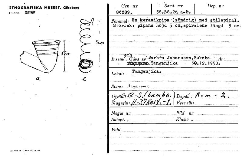 ELANDERS. 050502. il. 53. Lokal: Gen. n:r I •'• Sam!. n:r I Dep. n:r 86289, I 58.68.26, a-b). , Föremål: En. keramikpipaf ( söndrig) ned stål spiral . Storlek : pipans höjd 5 cm,apiralene längd. 9 cm, Insamloc.,Gåva avh ":Barlato Johansson ,Bukoba Ar: XtgapsC2~_ Tanganjika 39.12.11958. Tanganjika. -e a_ ETNOGRAFISKA MUSEET. Göteborg ETNOGR. Wi7g Stam: Ha - U Magasin: (111-37/0ile De Byte till: Negat. n:r Bild n:r Skiopt. „ Kliché„ Publ. [ocr]