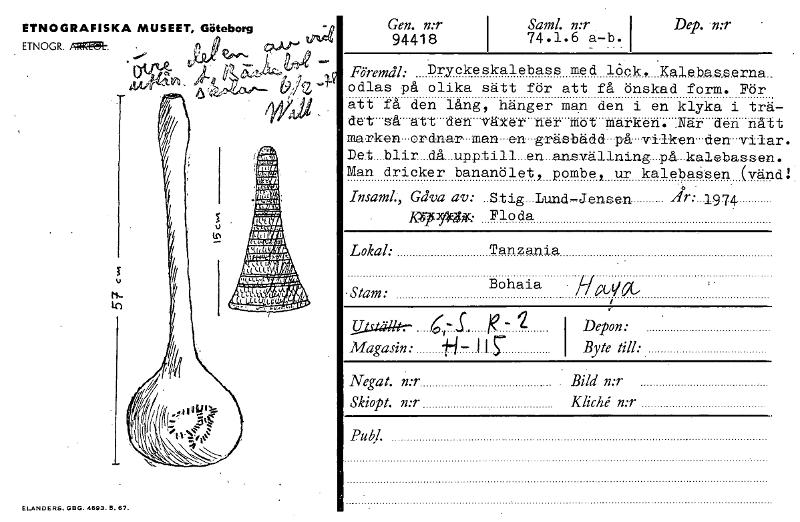ETNOGRAFISKA MUSEET, Göteborg ETNOW.AgMk • • rytm. r ,,,A-4191. i9j2 da, p." RUW gång MEW kumoym LIMUW ffigve40 SIMCA ammaara 4014 immeram N h. ELANDERS. GBG. 4693.5.67. Gen. n:r 94418 Saml. n:r . 1 74.1.6 a-b. 1 Dep. . mr , Föremål: Dryckeskalebass med löck, Kalebassernaodlas på olika sätt för att få önskad form. För att få den lång, hänger man den i en klyka i trä det-så att den växer ner mot marken. När den nåt marken-ordnar-man-en-gräsbädd-på-viiktn-den-viIä Det_blir_då_upptill_en_ansvällning_på-kalebasser Man dricker bananölet, pombe, ur kalebassen (vän e' ' ö . Insand, Gåva av: Stig...Lund-Jensen .zir: 1974, Kwyrku: Flo da Lokal: Tanzania • Stam: Bohaia GGVOL , ID1Wkr S g - 2 Magasin: ti- ii Depon: Byte till: Negat. n:r . Bild n:r Skiopt. n:r Kliché n:r Publ. [ocr]