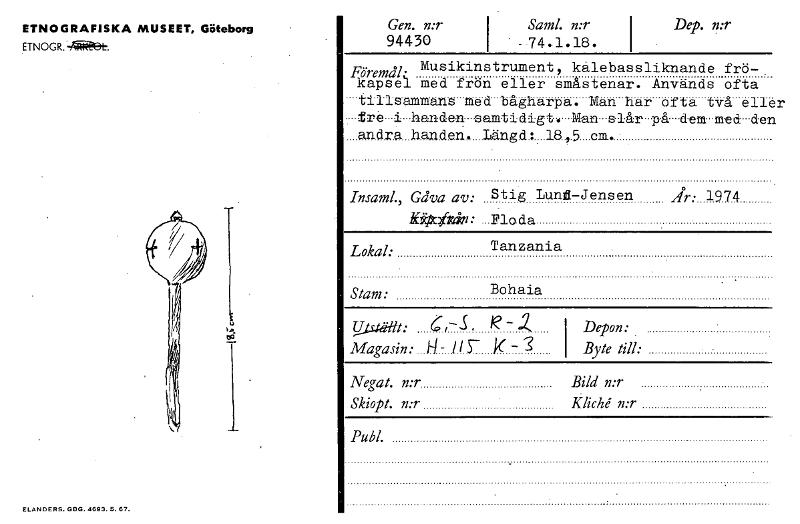 ETNOGRAFISKA MUSEET, Göteborg ETNOGR.-~. MT i Sam'. mr I Dep MT 94430 I 74.1.18. I .Före7. Musikinstrument, kålebassliknande frö-. kapsel med frön eller småstenar. Används ofta tillsammans Med båghårp...Visa hela