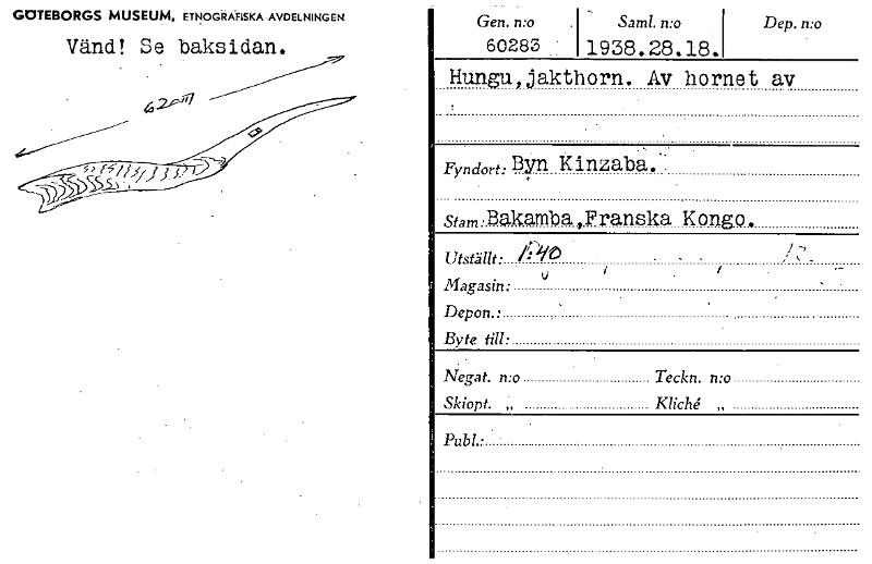 • GOTEBORGS MUSEUM, ETNOGRAFISKA AVDELNINGEN HunguAakthorn. Av hornet av Fyndort: Byn Kinzaba Stam .Bakamba ,Franska Kongo. Utställt. Magasin: Depon.: Byte till: Negat. n:o Teckn. n:o Skiopt. Kliché„... Visa hela