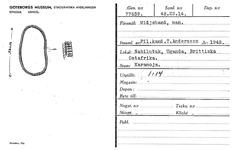 GOTEBORGS MUSEUM, ETNOGRAFISKA AVDELNINGEN ETNOGR. ARKEOL. Gen. n:r Sam!. n:r Dep. n:r 77659. 48.23.14. insand,avyil.kand Lokal: Nabilutuk, Ost afrika. -Stam: Karamoja. .T. "Andersson År: 1948, Uganda, Brittiska Föremål: :.Mi.c1..j.e.band man, Utställt:- Magasin: Depon.• Byte till: Negat. n:r Teckn. n:r Skiopt. Kliché „ Pub!. Euwim, Can, [ocr]
