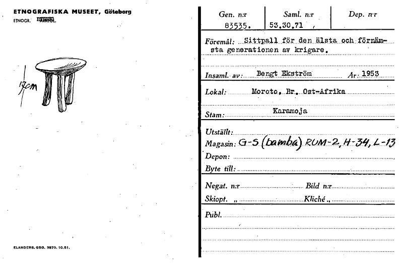• ETNOGRAFISKA MUSEET, Göteborg ETNOGR. RIM Gen. n:r Saml. n:r 83535. 53.30.71 , Dep. nr ELANDERS. GBO. 5870. 10.51. Föremål: Sittpall för den älsta och förnäm- sta generationen av krigare. Insaml. av... Visa hela
