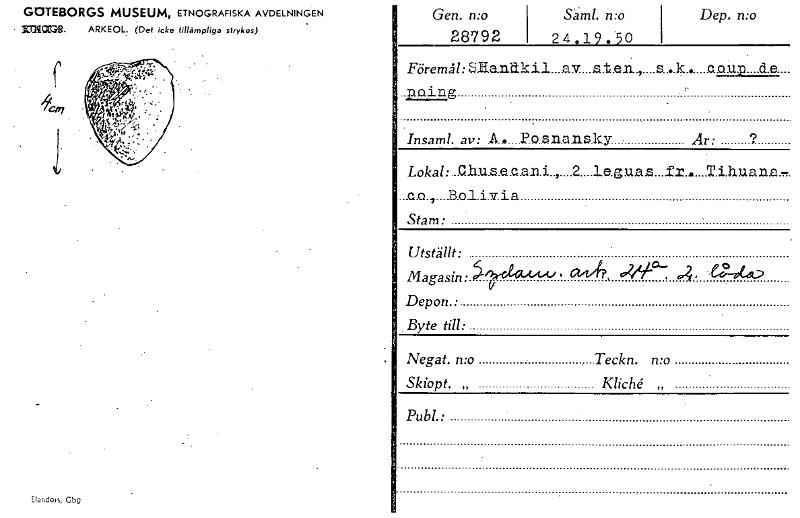 GOTEBORGS MUSEUM, ETNOGRAFISKA AVDELNINGEN 1:01102Z8. ARKEOL. (Det icke tillämpliga strykes) Elafide3, Gbg Gen. n:o 28792 Sam!. n:o 2 4 . 1 9 . 15 0 Dep. n:o Föremål:SHan.dkil....av....,s.ten.,....s.....