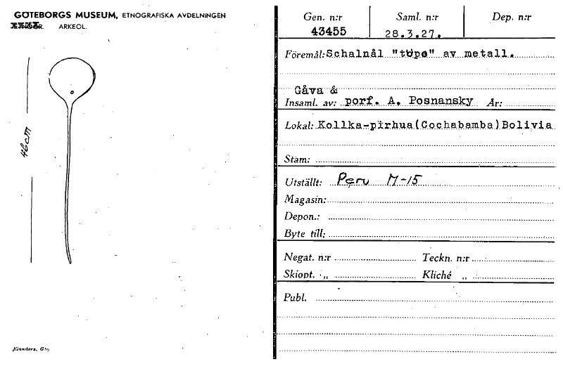 • Gen. n:r Samt. n:r 43455 2 8. 3 . 2'7 . Dep. n:r GOTEBORGS MUSEUM, ETNOGRAFISKA AVDELNINGEN ~SR. ARKEOL. Föremål:SehaliAl "tCpci" av .m.e tall.. Gåva & Insaml. av: porf. A, posnansky År: Lokab.Kallka... Visa hela