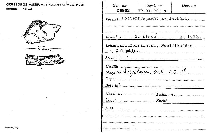 GOTEBORGS MUSEUM, ETNOGRAFISKA AVDELNINGEN ~MR. ARKEOL. Blondera, Gbg • Gen. n:r 39842 Saml. n:r S7.21 • 723 \T' Dep. n:r Föremål: Bo ttenfragment av 1 erkärl . . . r Insaml. av: S. Linne År: .1927— Lokal: Cabo.41arrie.nt.es.,..Pacifikslidan, ..:.. -.. Colo-mbia. , Stam: * Utställt: . Magasin: Cla-.144 , 61-2-Å . / r , De port.; Byte till: - Negat. n:r Teckn. n:r Skiorot. „ Kliché „ Publ. , [ocr]