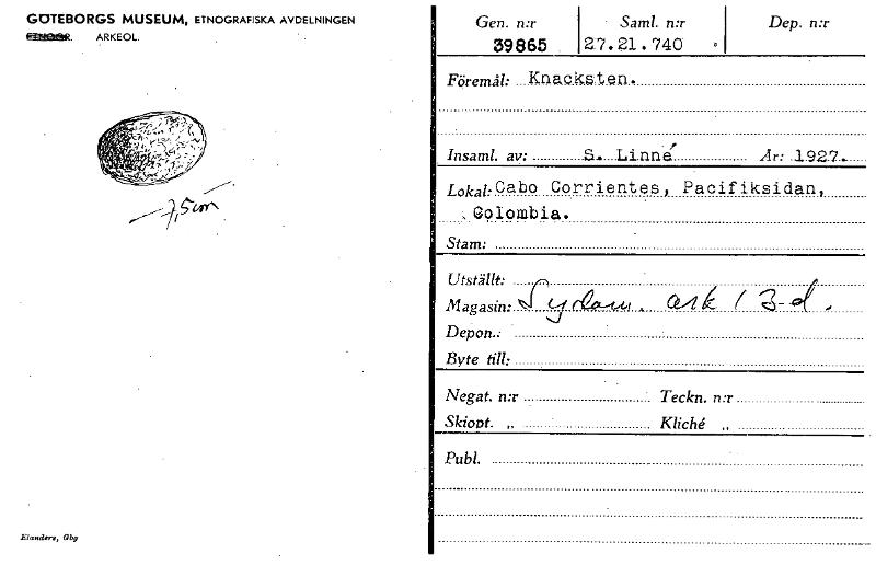 • GOTEBORGS MUSEUM, ETNOGRAFISKA AVDELNINGEN Enteet2 ARKEOL. Elanders, Gbg Gen. n:r 39865 . Samt. n:r 2.7. 21 . 740 u Dep. n:r Föremål: Knackst en. • Insaml. av: S. Linney Ar: 1.92.7- Lokal: Cabo Cor... Visa hela