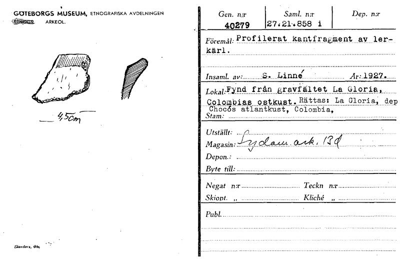 • GOTEBORGS MUSEUM, ETNOGRAFISKA AVDELNINGEN ~13. ARKEOL. -9-37-1 1;ianders, Gb‹. Gen. n,...r 40279 Saml. n:r 27: 21,4 858 i Dep. n:r Föremål: Prof i lerat kant fraeMent av ler- kärl. Insaml. av: $,. Linne/ Ar:..1.927. Lokal:/' d från gravfäl te t La Gloria I Colombias ostkust. Rättas: La Gloria, del Choc6s atlantkust, Colombia, Stam: Utställt: K? Depon.: Byte till: Negat n:r Teckn n:r Skiopt. „ Kliché „ Publ. [ocr]