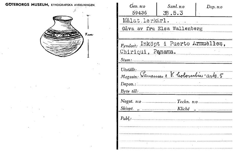 • GDTEBORGS MUSEUM, ETNOGRAFISKA AVDELNINGEN. den. n:o Sam!. n:o 59436 Dep. n:o Målat.Lerkårl. Gåva av ini Elsa Wallenberg Fyndort: Inköpt •i Puerto Armuällep, Cbiriqui, Pqnama. Stam • Utställt. Magasin... Visa hela