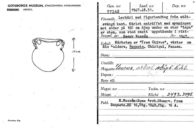 GOTEBORGS MUSEUM, ETNOGRAFISKA AVDELNINGEN SZOMEX ARKEOL. Gen. n:r " Sam!; n:r 77143 . - 11947.48.51.- _ Dep. n:r Föremål-, Lerkärl med figurhandtag från utåt- svängd kant. Kärlet anträffat med mynni...