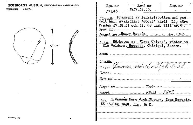 GOTEBORGS MUSEUM, ETNOGRAFISKA AVDELNINGEN ARKEOL. Elanders, Gbg Gen. n:r 771.457 ' . ' . Saml. n:r "47°48853. -- v Dep. n:r . , ._ _ , -Föremål: Fragment- av lerkärlsbotten_med gam- malt hål. Avsiktligt "dödat" kärl? Låg nåra -fYtdet-47:48;51-ach..752. Ss* atm. till nr.51. -Grav-II.. Insaml. av: - Henry:Wassn -..-- , Ar: 1947. ... - - Lokal: Närheten av "Tres Chivos", väster om • Rio Caldera,Boulte, Chiriqui, Panama. ' Stam: Utställt: A Magasin• -ir . Depon • Byte till: . Alegat. MT Teckn.n:r Skinpt. „ Kliché Publ. H.Wasset:Söme Arch.Observ. from Boquete. ES 16.Gbg.1949, fig. 16 C.. [ocr]