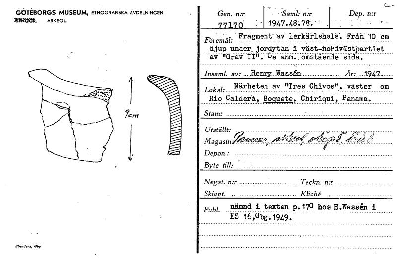 GCJTEBORGS MUSEUM, ETNOGRAFISKA AVDELNINGEN Mrgrögtfi. ARKEOL. Elex.ders, Gbg Gen. n:r • - Samk ' n:r 77170- -1 1947 .4:78. ' . Dep. n:r Fören41: -.Frågment av. lerkätlshalS'.. Från: '10 dm . - djup under_jordytän i väst-hodvästpartiet av "Grav II". 5e anm..omstående sida. hisaml. av:__Renry...Wassån Ar: 1947. Närheten av "Tres Chivos".,väster om Lokal: Rio Caldera, Poouete, Chiriqui, Panama. Stam: Utställt: J e, Depon.: Byte till: Negat. n:r Teckn. n:r Skiopt. „ Kliché Publ nämnd i texten p.170 hos H.Wassen i ES 16,Gbg.1949. ft/ [ocr]