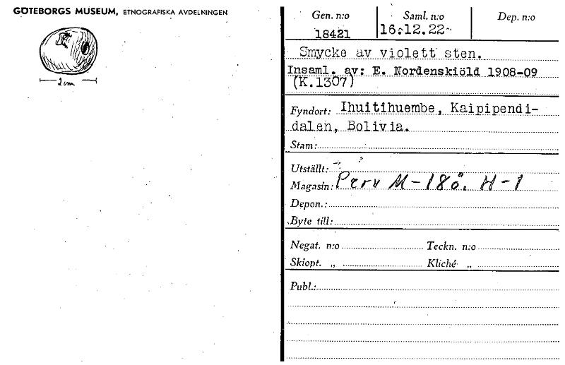 • GOTEBORGS MUSEUM, ETNOGRAFISKA AVDELNINGEN • • Gen. n:o Sam!. n:o 18421 •16:12.22- Smycke av violett sten. Insaml. ay: E. Nordenskiöld 1908-09 (K.1307) Fyndort: Ihuitihuembe, Kaipipendi- dalen, Bo... Visa hela