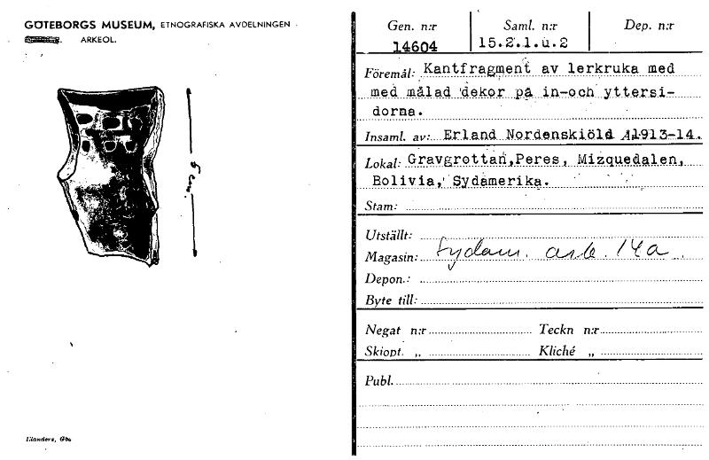 GOTEBORGS MUSEUM, ETNOGRAFISKA AVDELNINGEN eggiaU. ARKEOL. Mantlars, Gbk ! Gen. n:r , 14604 Sam!. n:r 15.2.1.d.2 Dep. mr - Rit.eing: Kantfragmen't av lerkruka med med målad dekor pg in—och' yttersl- : dorna. hisamL av: Erland Nordenekiö1.a.A/1.913=14... Lokal: Gravgrottad,Peres, MiZquedalen, ' Eoliviat'Sydarderika. « " r ' Stam: •., Utställt: Magasin: i Cli6-', nfl : Depon.: Byte till: . Ålegat n:r Teckn n:r : Skiont. „ Kliché „ Publ.. , „ [ocr]