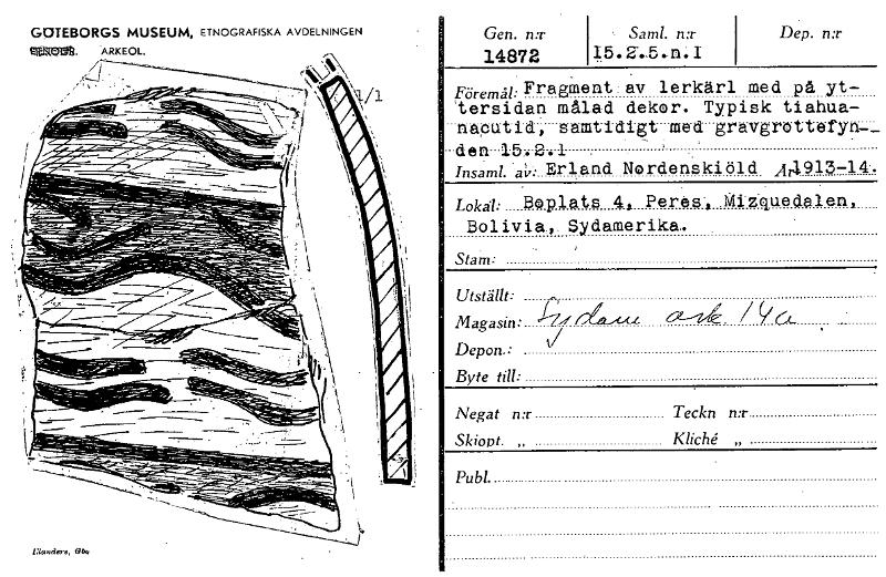 GOTEBORGS MUSEUM, ETNOGRAFISKA AVDELNINGEN *ARKEOL. rS`■> • EiaNders, Gb9 Gen. n:r 14872 .. Sam!. n:r ....5.n.I I.5.2' I.5.2' Dep. n:r Föremä:Fra gment,av lerkärl med på yt- 'tersidan målad dekor. Typisk tiahua- naputid, samtidigt med gravgrotteryn„ -den-15:2-.1 Insami. av Erland Nordenskiöld Ar1913-14 Lokal: Boplats 4* Peres, Mizbluedalen, Bolivia, Sydamerika. Stam: Utställt: r, Magasin: 1-ix-c. 6z---"Z"‘ / Y Ce , Depon • j Byte till: Negat n:r Teckn n:r Skiopt. „ Kliché „ Publ.. [ocr]