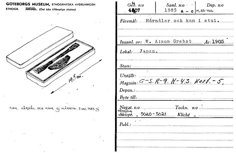 Är: 19.05 Föremål: HårnAlar ocb kam i etui. Insaml. av: W9 A:son Grebst Lokal: J-i:Den, Stam: Utställt i Magasin. å- 4/, 3 /1(4Y; Depon.: Byte till: GOTEBORGS MUSEUM, ETNOGRAFISKA AVDELNINGEN ETNOGR. »RMSL. (Det Icke tillämpliga strykes) Ge. n:o .47 Saml. Dep. n:o 1885 a - c K..83t lok, -k-P4 tsk.. H7,R....14;,,t_ ou+ -KANk å m5, Petc-r-Pr. 5. Dec_ igel 5 Negat. n:o -Sktopt. „ 50r2.4) - SOD.1 Teckn. n:o Kliché „ Pub!.: [ocr]