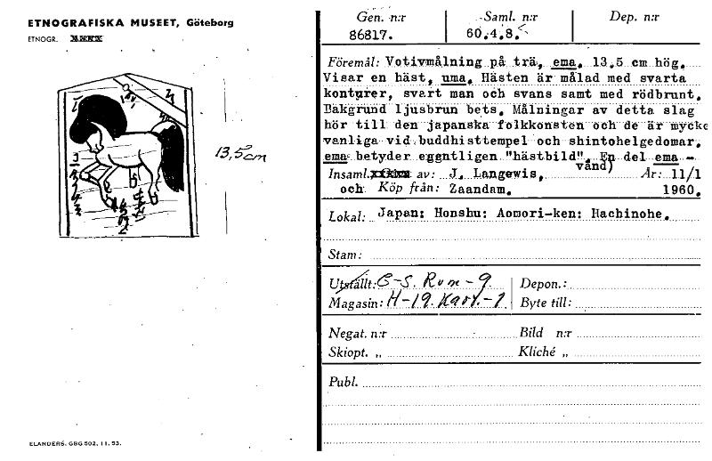 ETNOGRAFISKA MUSEET, Göteborg ETNOGR XX= ELANDERB. GBG 502. 11. 53. Gen; n:r 86817. —Saml. fur i 66,4,8:- Dep.mr 1 Föremål: Votivmålning_pikträ\, Visar en häst, uma, Hästen _ .ema, 12,5 cm_hög, är • målad svans samt Målningar vanliga-vid7buddhisttempel:och-shintohelgedomar, folkkonsten med svarta med rödbrunt, av detta slag och de är myck uhästbild!!...n-del-ema--- kontgrer, svart Bakgrund ljusbrun hör-till:den-japanska emu..betyder_eggntligen man °Ck bets, J, Lange7wie, Zaandam, Insaml.~r av: och Köp från: vand) Ar:_11/1 1960, Lokal: Japan: Honshu: Aomori-ken: Hachinche, Stam: U ällt:6›.--J. kv,it-7 Magasin: lq— i 9. 1(4, -"- i Depon.: Byte till: - Negat. n:r Bild n:r Skiopt. „ Kliché „ Pub!. [ocr]