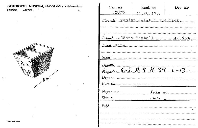 • GOTEBORGS MUSEUM, ETNOGRAFISKA AVDELNINGEN ETNOGR. ARKEOL. Gen. n:r 50873 Sam!. n:r 31.48.173. Dep. n:r Föremål: Trämått delat -två fack 12andere. Gbo Insaml. e il Är:19.31. Lokal: Stam: Utställt: ... Visa hela