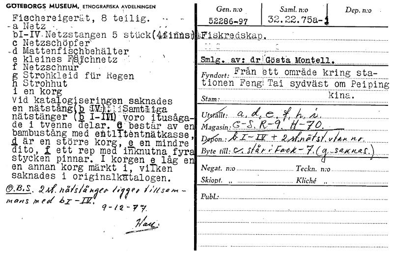 GOTEBORGS MUSEUM, ETNOGRAFISKA AVDELNINGEN Fischereigerät, 8 teilig. -a Netz bI-IV-Netzstangen 5 stiickkfitita c Netzschöpfer` ,d MattenfisObehälter, N e kleines Fplychnetz f Netzschnur g Strohkleid ftir Hegen h Strohhut i en korg Vid katalog'seringen saknades en nätstång bWitlSamtliga nätstänger E. I- b Voro itusåga de i tvenne 7elar. d består av e bambustång med ehtliUntnätkasse, • är en större korg, e en mindre dito, 1 ett rep med iriknutna fyr stycken pinnar. I korgen e låg e en annan korg märkt i, vilken saknades i originalkutalogen. CO,B,S , .2449. ha/1'411e,- /Ile, /r/l fr■-t M are S me i 46z Gen. n:o , 52286,97 Samt. n:o Dep. n:o i 32.22.75a- , Fiskreds ap, Sm1g, ex: dr GOs .a. Montell. . 1 Fyndort: Från ett område kring sta- tlonen FengTai sydväst om Peiping kina. Stam • i t . Up?: i Magasin: ---S + .2-441;41, v 1/4s. n- 0°- Byte till: C/i' i/b A ; ra,e,e— 76 _Setxxetr Negat. n:o Teckn. n:o Skiopt. „ Kliché Publ.: , [ocr]